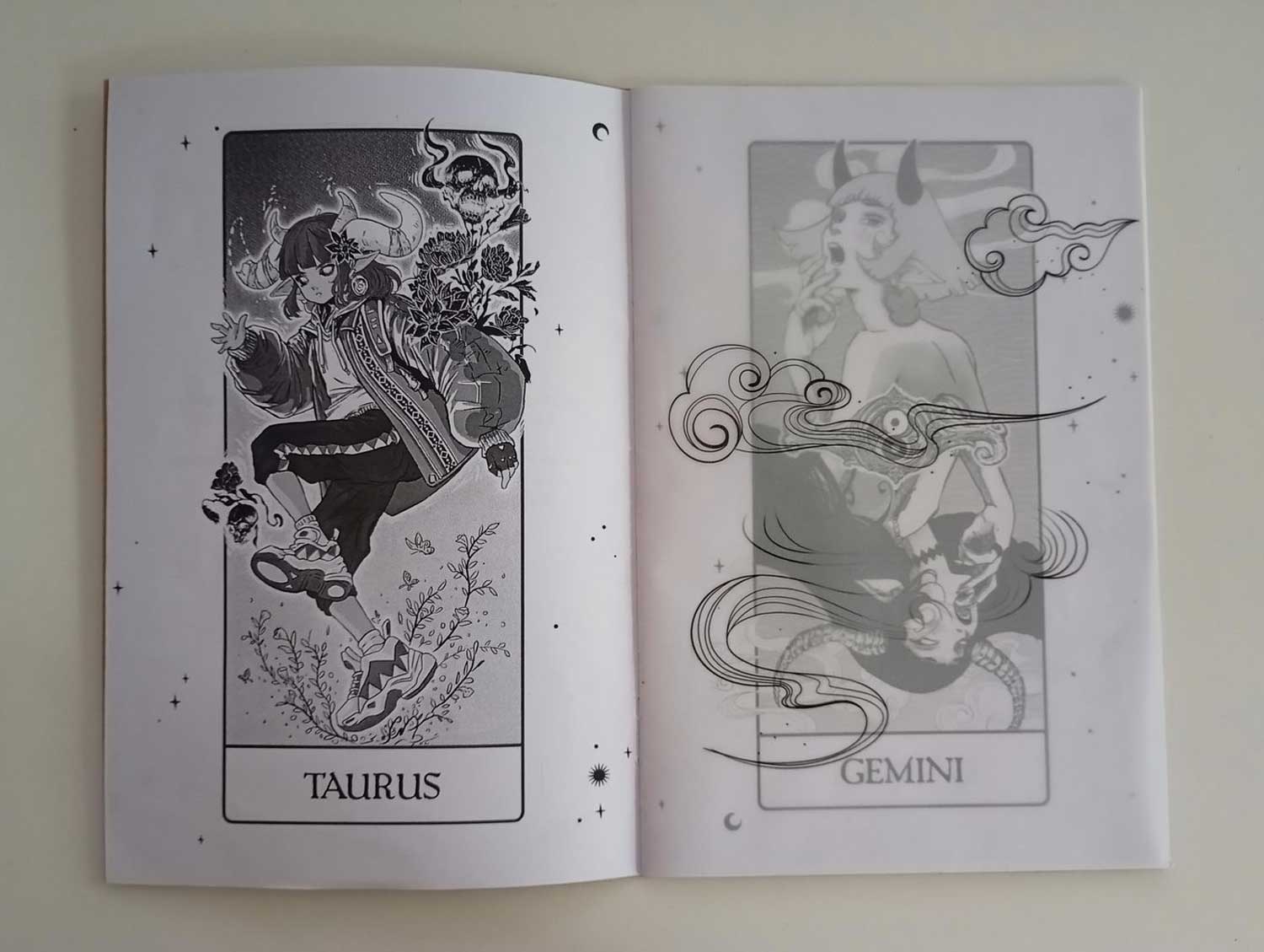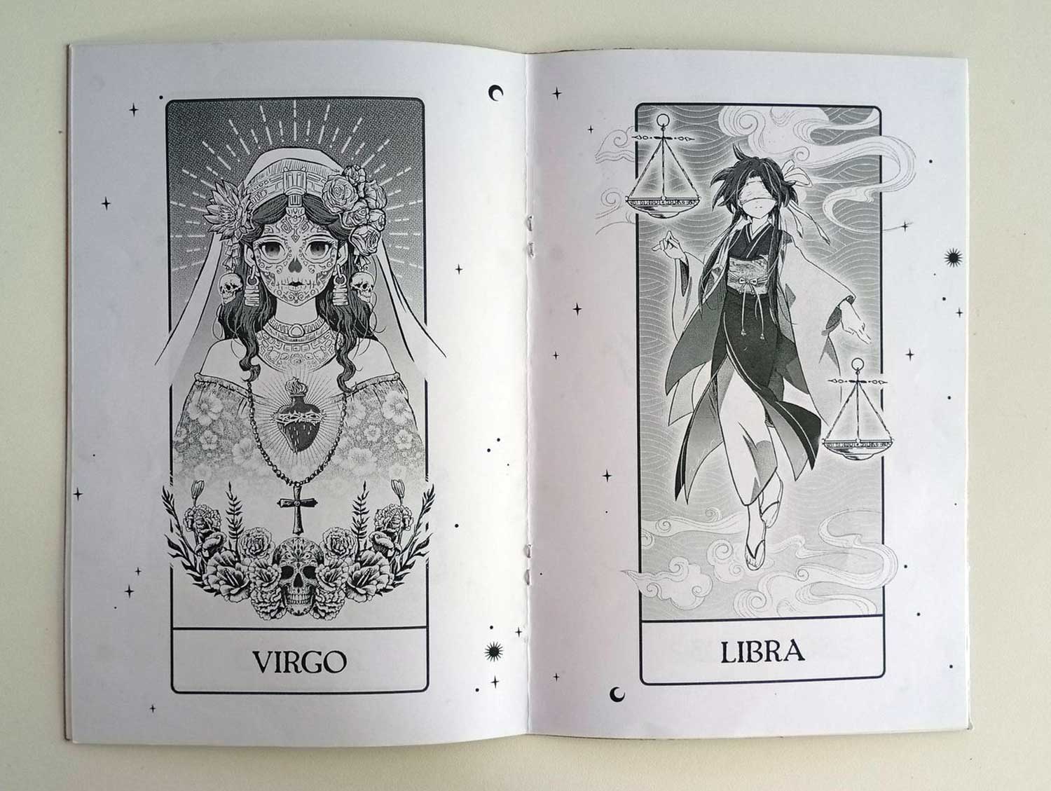 12 ilustraciones zodiacales, representados a través de los 4 elementos y 4 culturas: Fuego Egipcio, Agua Polinesia, Aire Japones, Tierra Latina. Incluye hojas de papel vegetal y cubierta papel madera. Ilustrado en conjunto con Carolina Paredes